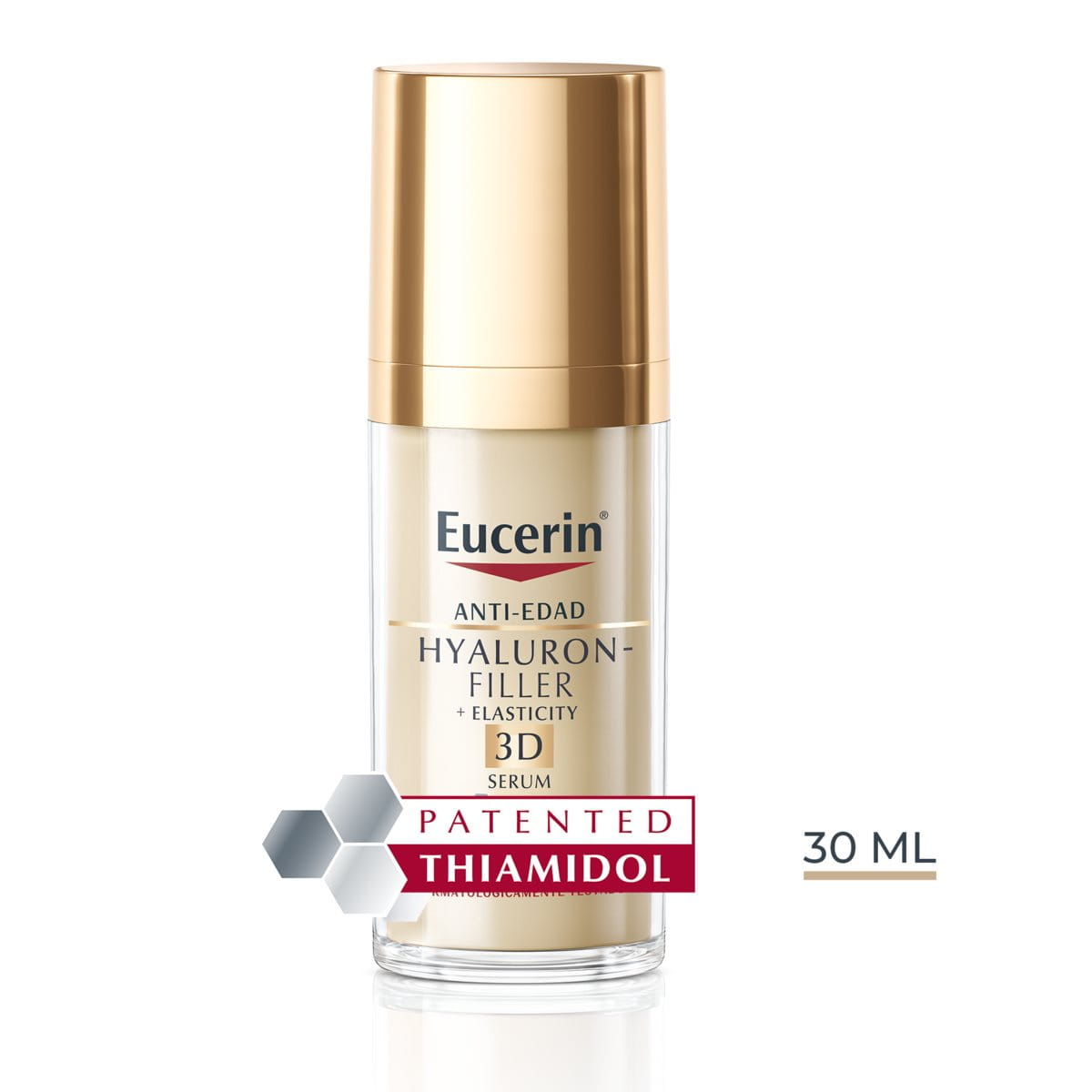 El sérum contiene Ácido Hialurónico de alto y bajo peso molecular, que mejora la hidratación de la piel, pero no está formulado para reemplazar una crema de día o noche o una crema para el contorno de ojos especializada. Para conseguir unos resultados óptimos, te recomendamos utilizarlo en combinación con los otros productos de la gama Eucerin Hyaluron-Filler + Elasticity.
