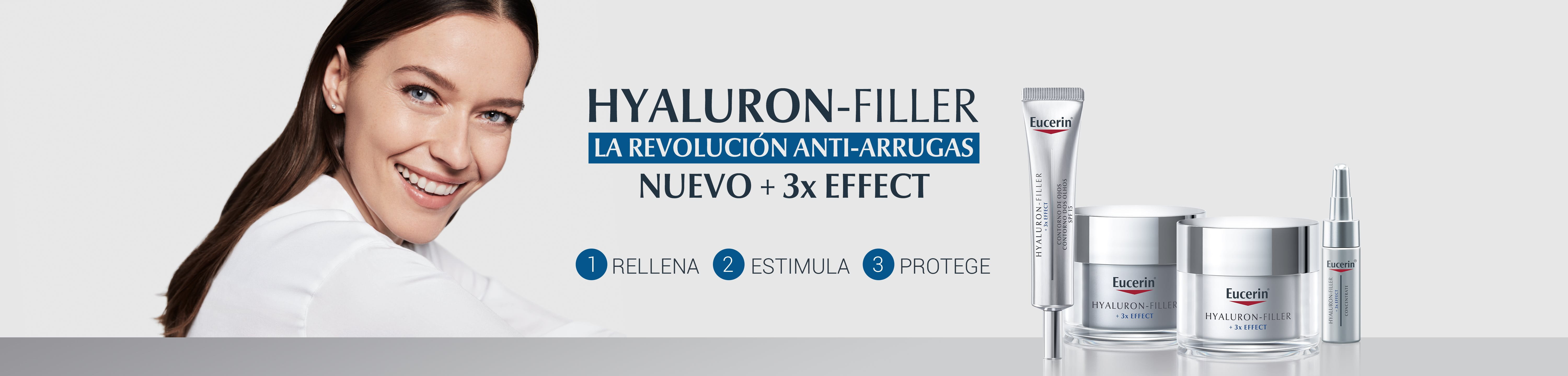 - Eucerin Hyaluron-Filler con fórmula 3x Effect contrarresta el proceso de envejecimiento. Rellena las arrugas, estimula y defiende los niveles de hyaluron en la piel. Para una piel visiblemente más joven, suave y radiante.