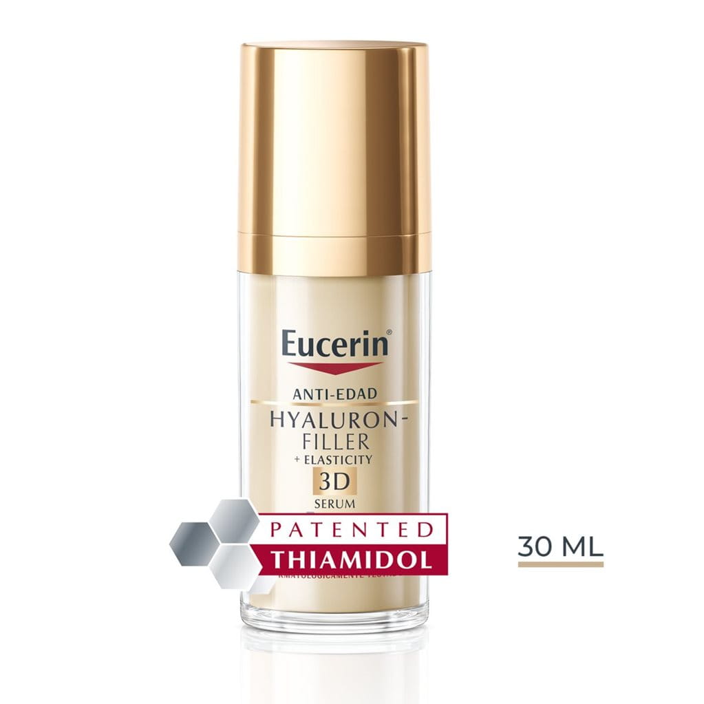 Inspirado en los tratamientos dermatológicos, Eucerin Hyaluron-Filler + Elasticity 3D Serum facial es un serum Anti-Edad ligero e hidratante que trata eficazmente las 3 dimensiones del envejecimiento dérmico: